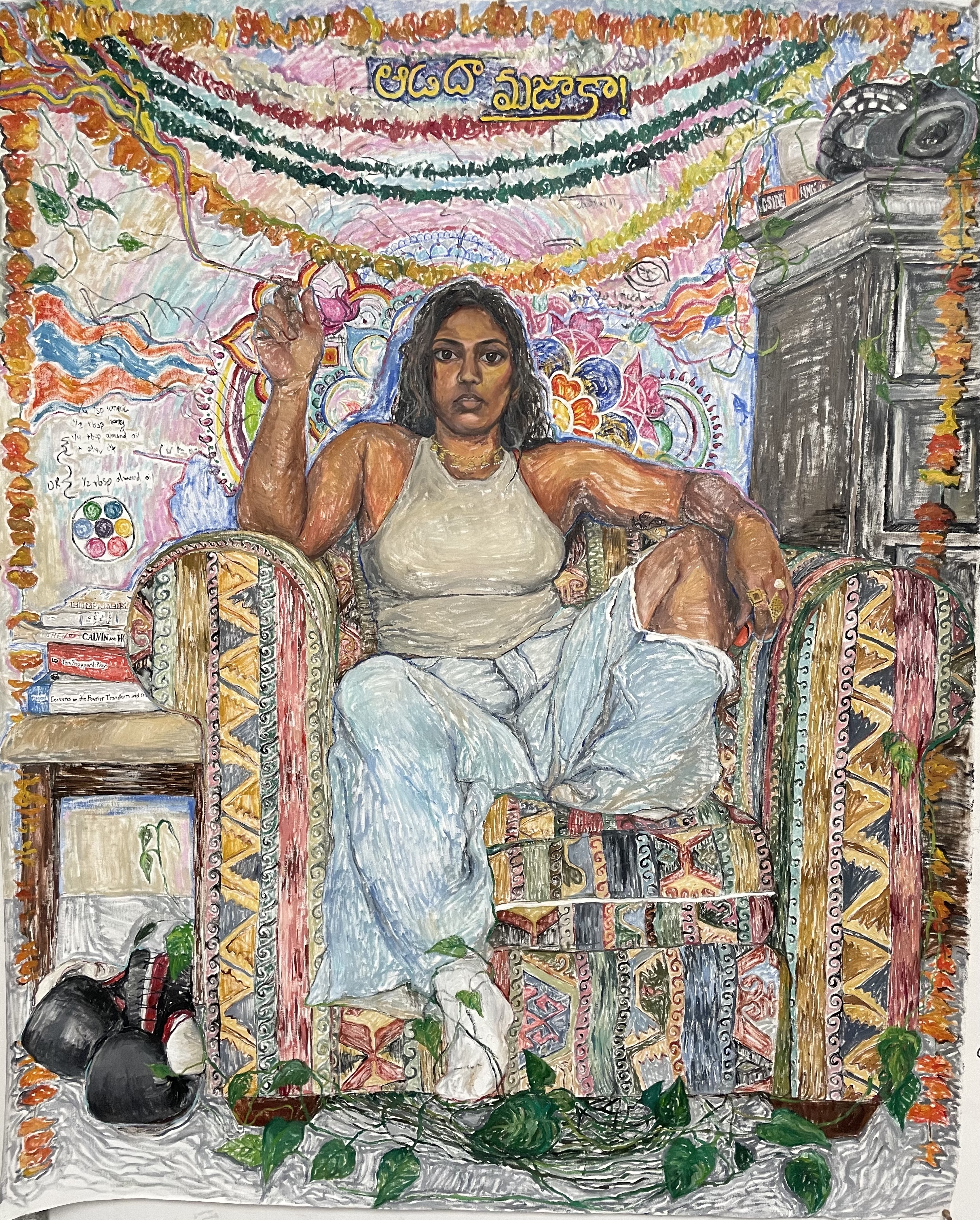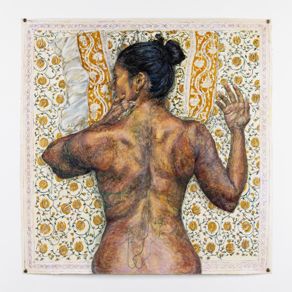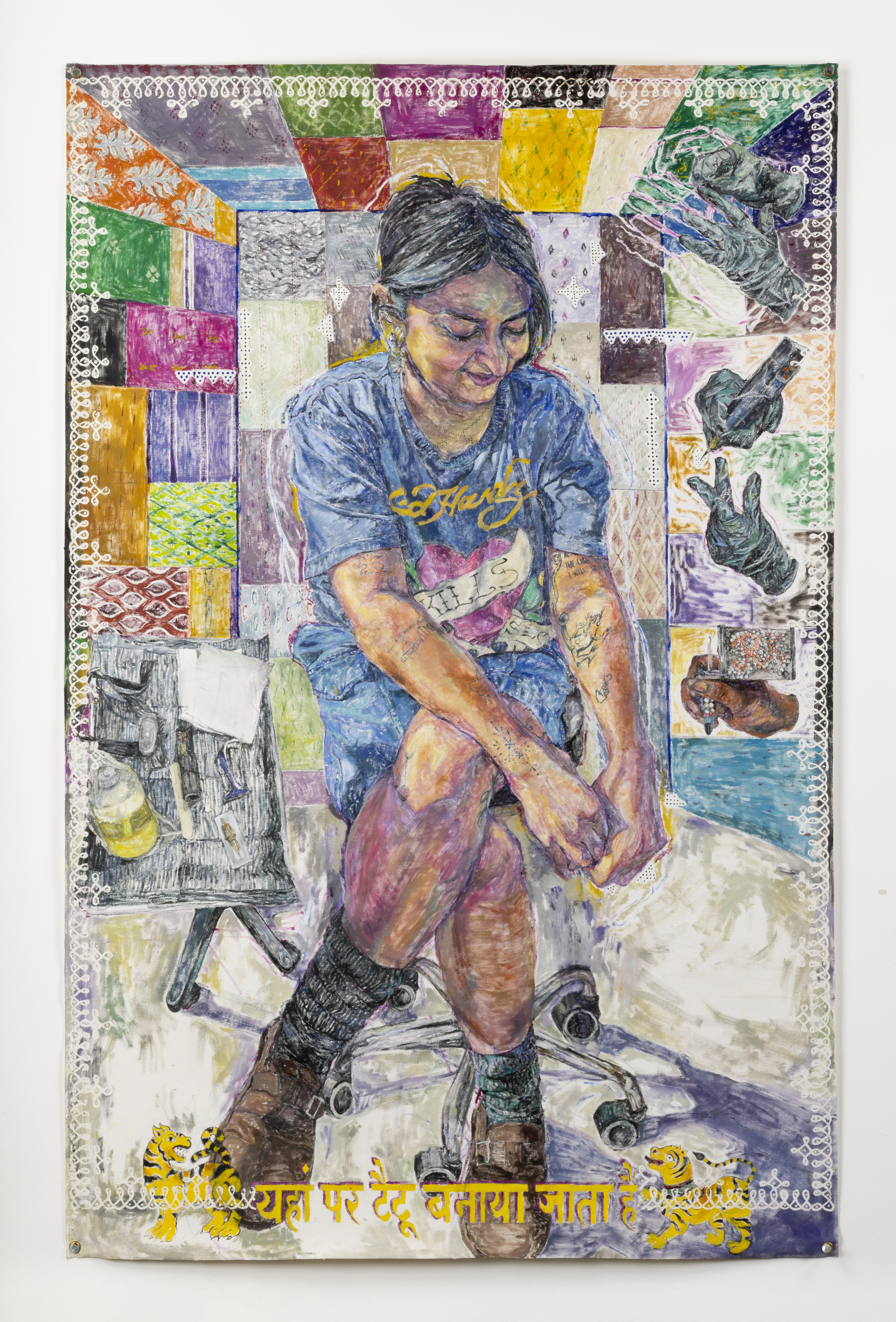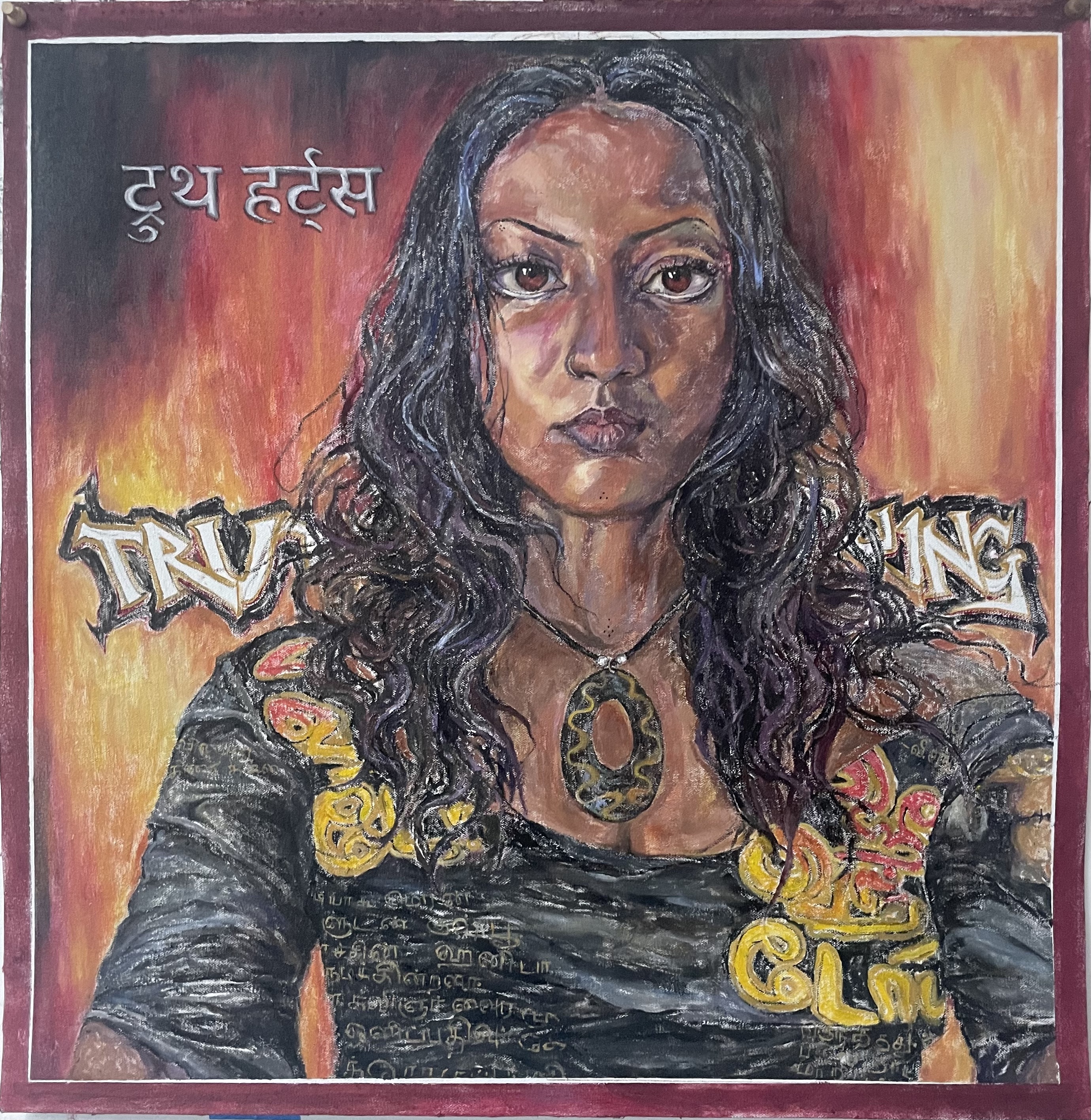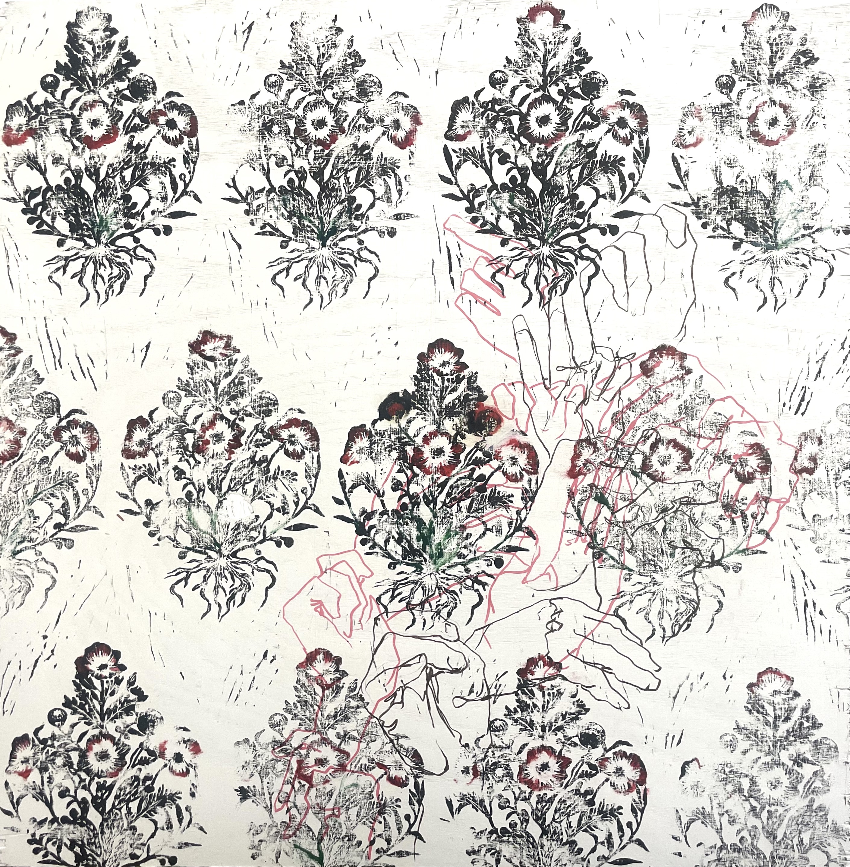 Blockprint, marker, and oil paint on wood, 24″x24″